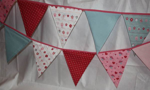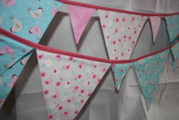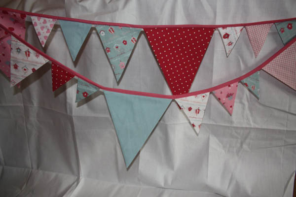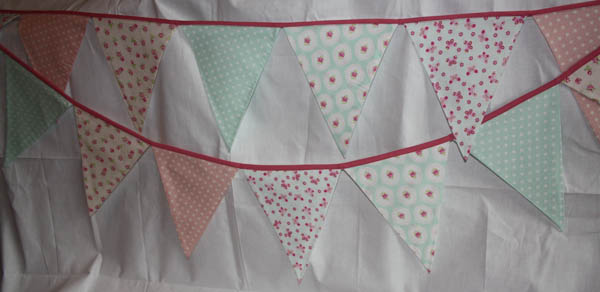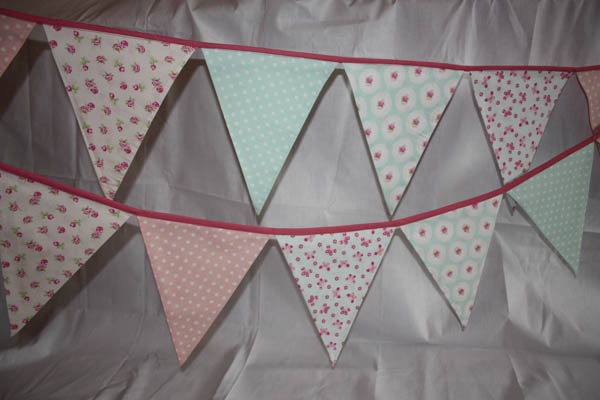 - Blaue und Rosa Fähnchen mit zwei verschiedenen Blümchen-Mustern.